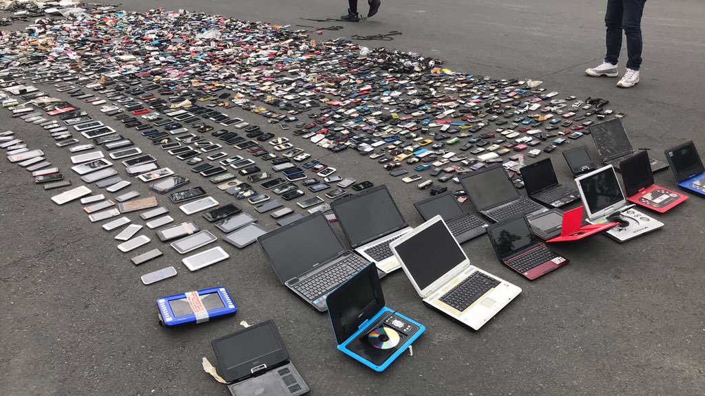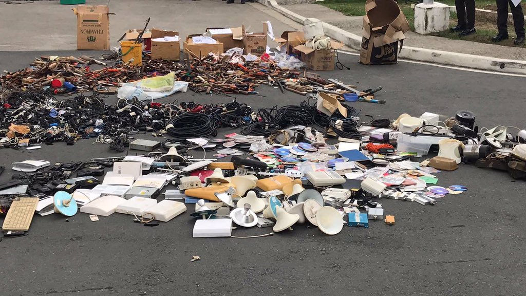 Per a tweet from CNN correspondent @pnbarcelonlive, Among the destroyed tech were 3,817 cellphones, 101 pocket wifi units, 41 tablets, and 7 laptops, along with tobacco bars, cigarettes, and weapons.