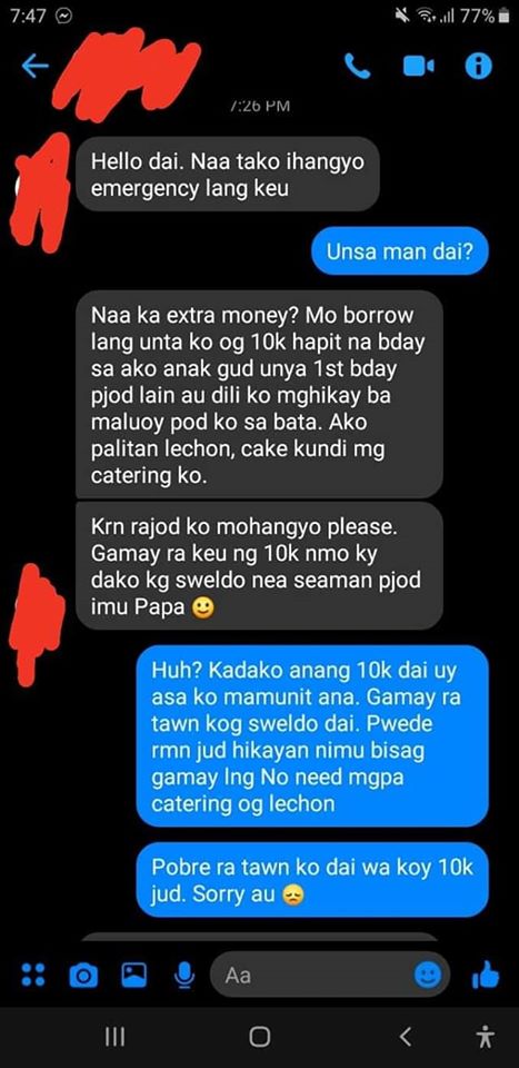 Bigla raw siyang minessage nito para sana umutang ng 10,000 para pang handa sa anak nitong mag cecelebrate ng first birthday.